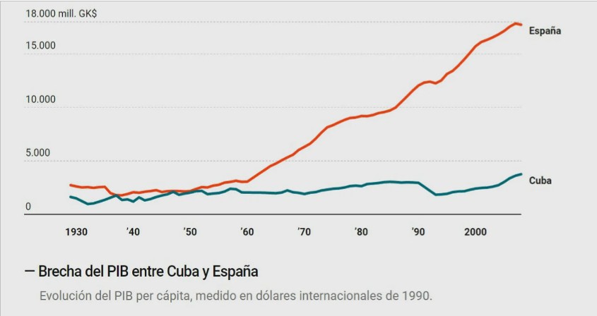 Y es que, como ya explicamos detalladamente en Libre Mercado, la revolución socialista de Fidel Castro convirtió en un auténtico infierno el, hasta entonces, vibrante y próspero país cubano. Recordemos que, antes de la revolución, Cuba era un 80% más rica que los países latinoamericanos y su mortalidad infantil era menos de un tercio que la de las demás naciones de su entorno. De hecho, antes de 1959 el Producto Interior Bruto per cápita de la isla era igual al español, pero, a partir de la revolución, podemos observar cómo este indicador despega en España, mientras que el cubano queda casi estancado.