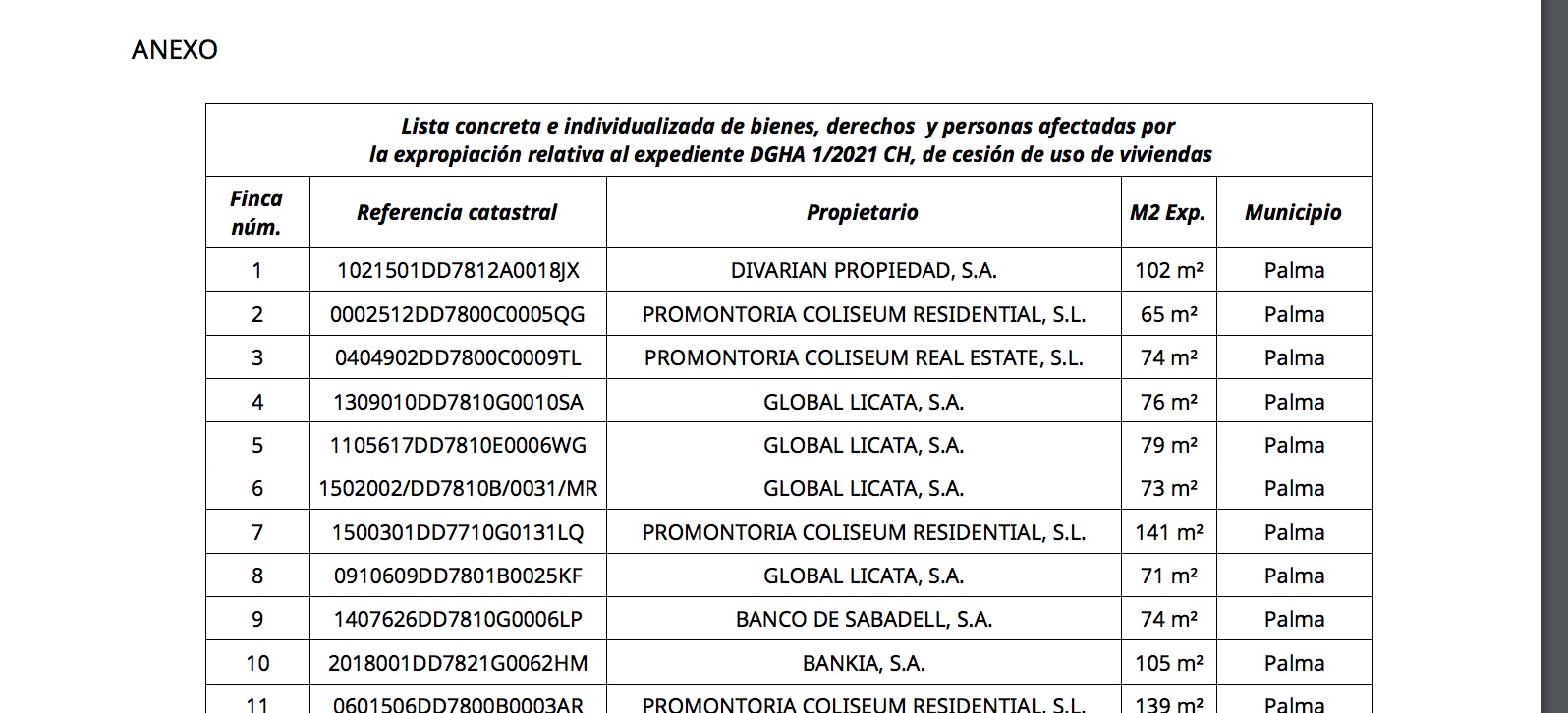 La expropiación de 56 viviendas en Baleares ya es oficial. Así lo publicó ayer jueves el Gobierno de la socialista Francina Armengol en el Boletín Oficial de las Islas Baleares (BOIB) junto con los nombres de los propietarios afectados. En esta lista negra se encuentran conocidas entidades, como Bankia, Banco Sabadell o BBVA. Además, aparecen sociedades como la Sareb -el llamado banco malo- o conocidas inmobiliarias, como Aliseda, propiedad de Blackstone y Banco Santander. También hay otras empresas menos conocidas, como puede ser la menorquina Gasolina y Gasoils Low Cost, a la que se le arrebatarán 9 viviendas.