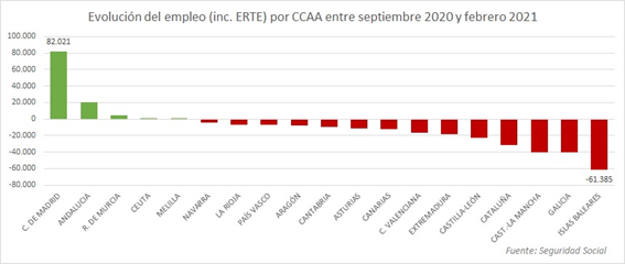 Desde que en septiembre el Gobierno de España asumiera el mando de gestión de la covid las comunidades autónomas, Madrid ha sido de lejos la región que más empleo ha creado. Si tenemos en cuenta la variación de la afiliación y el descenso de los ERTE, Madrid ha generado más de 82.000 puestos de trabajo, frente a los 183.000 que ha destruido España en su conjunto, con Baleares, Galicia, Castilla-La-Mancha y Cataluña a la cola.