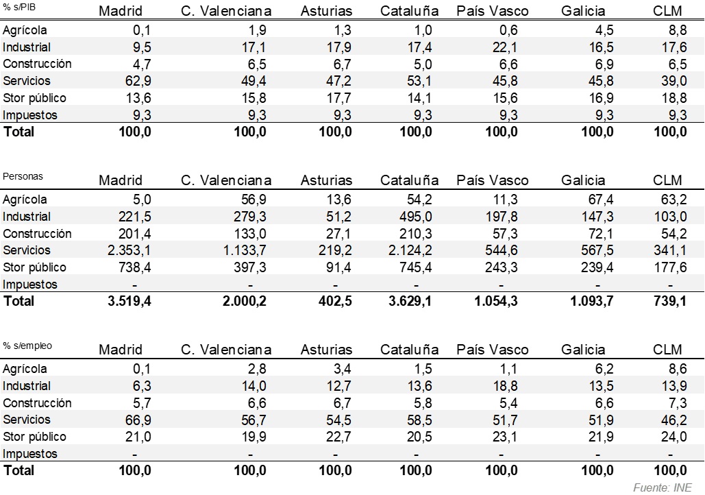 Algo similar ocurre en términos de empleo, donde el sector servicios de la Comunidad de Madrid emplea a más personas incluso que en Cataluña.