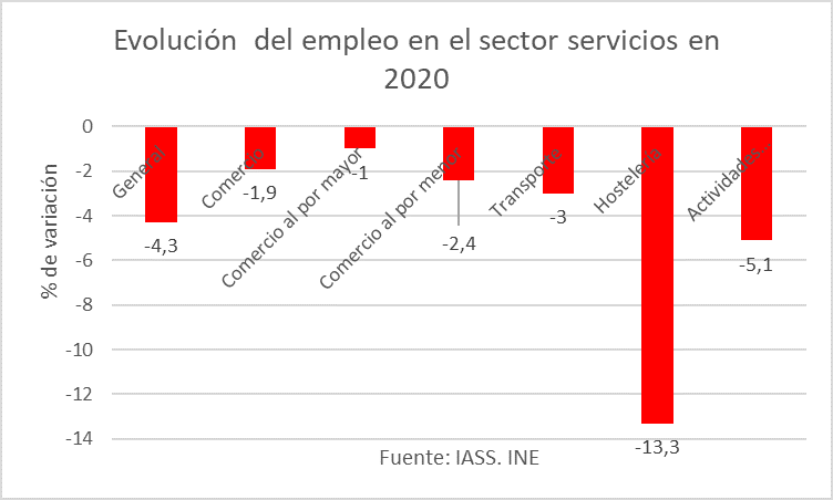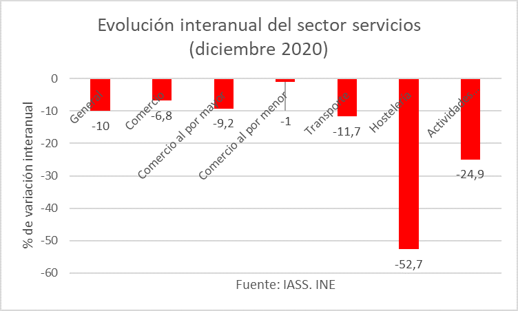 El deterioro ya es muy intenso, como muestra la evolución de estos sectores. De esa manera, en diciembre de 2020 caen todas las ramas de actividad recogidas en el Indicador de Actividad del Sector Servicios: el índice general cae un 10%; el comercio lo hace un 6,8%; el comercio al por mayor, un 9,2%; el comercio al por menor, un 1%; el transporte, un 11%; la hostelería, un 52,7% y las actividades administrativas y auxiliares, un 24,9%.
