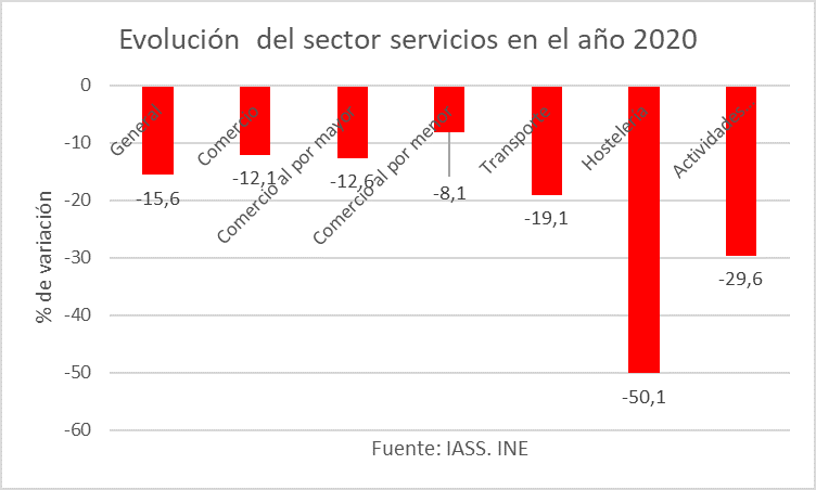 Si analizamos los datos en el conjunto del año, la caída es todavía más intensa, salvo en la hostelería, que es similar y que muestra la intensidad que esta rama de actividad ha sufrido durante todo 2020.