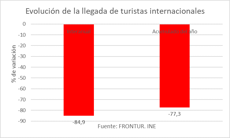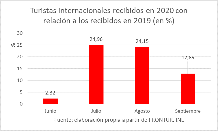 De hecho, si analizamos los cuatro meses que tienen días correspondientes a la estación de verano, vemos que la proporción de turistas internacionales recibidos en 2020 respecto a los que llegaron en 2019 es muy pequeña: un 2,32% en junio, un 24,96% en julio, un 24,15% en agosto y un 12,89% en septiembre.