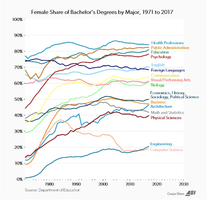 Hace 50-100 años, no había mucha diferencia en los números de mujeres matriculadas en las diferentes carreras. Había pocas de todo. En EEUU, por ejemplo, en 1950, menos del 25% de los licenciados y del 10% de los estudiantes de doctorado eran mujeres.