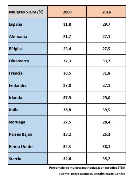 Y un dato: España no es muy diferente al resto de la UE. Aunque a veces lo parezca, la realidad es que en nuestro país el porcentaje de mujeres en estos sectores es parecido al de nuestros vecinos. Hay muchas estadísticas, en función de la definición que tomemos, podemos aparecer algo por encima o por debajo de la media, pero no hay nada muy llamativo en las cifras de nuestro país.