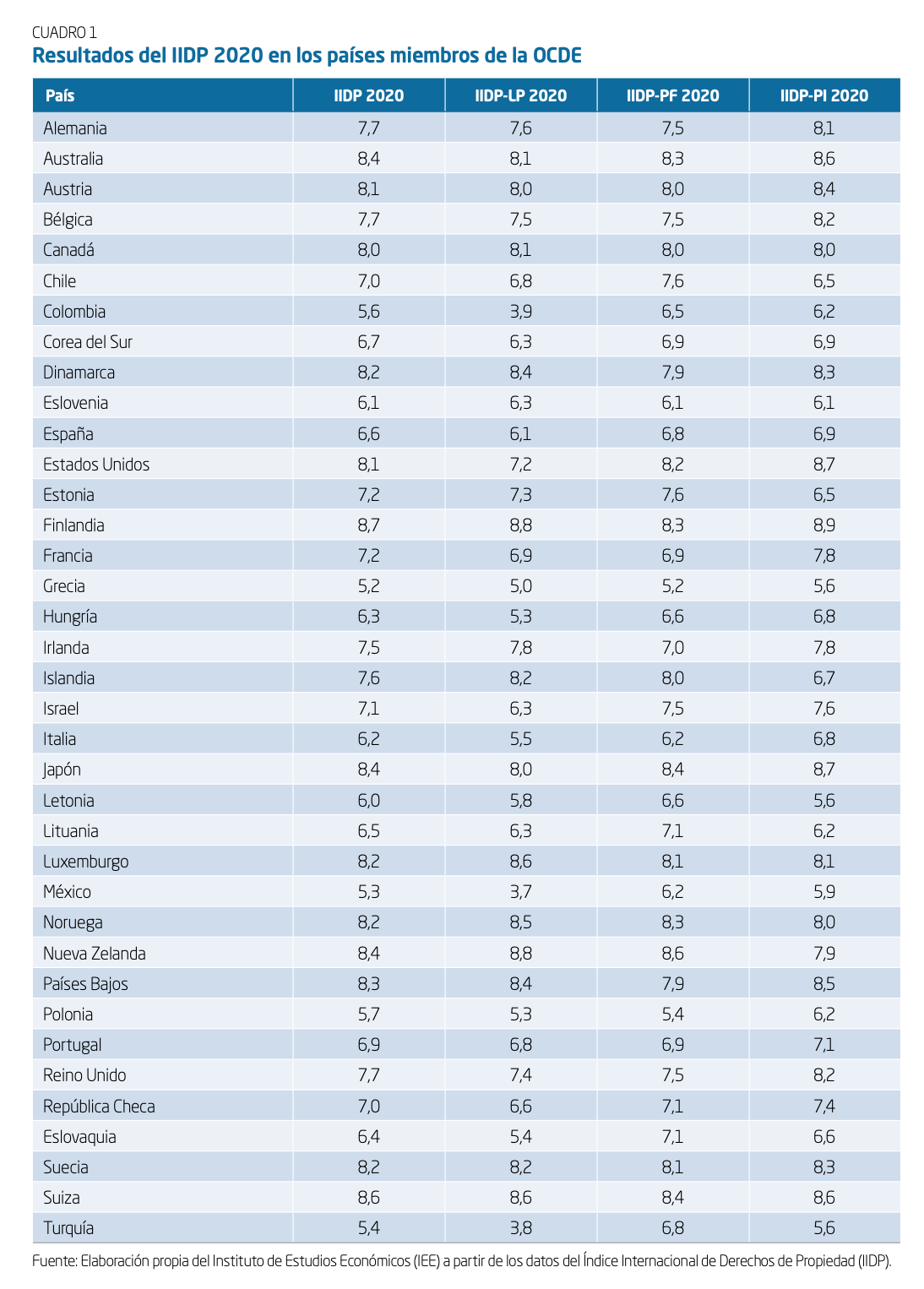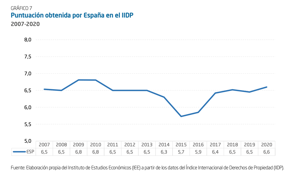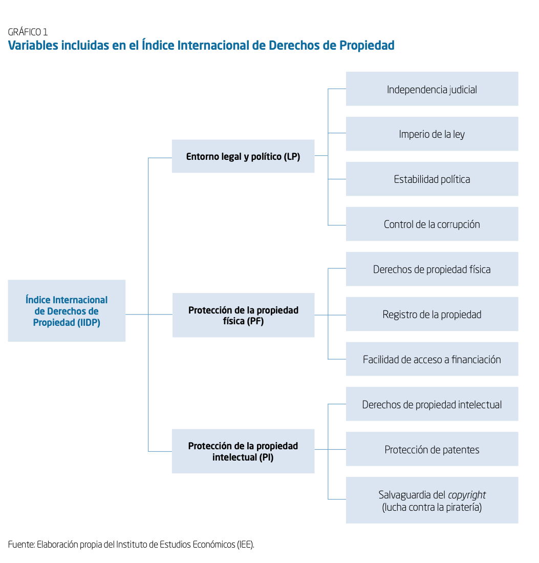 La mejor forma de responder a esta pregunta es acudir al Índice Internacional de Derechos de Propiedad (IIDP), una publicación anual de la Property Rights Alliance que divulga en España el Instituto de Estudios Económicos. Esta medición toma en consideración tres grandes variables de estudio: el entorno legal y político, la protección de la propiedad física y la salvaguardia de la propiedad intelectual.