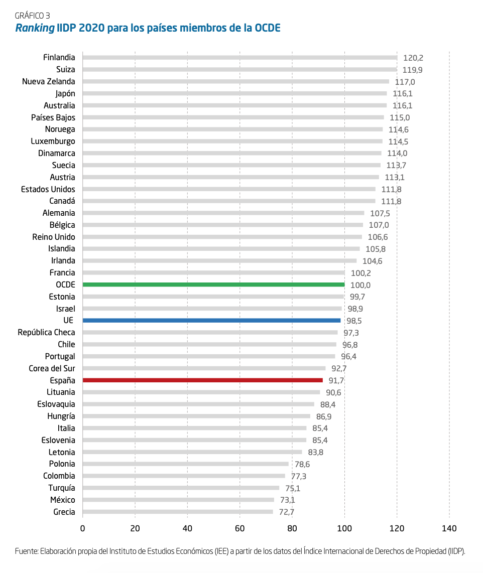 En cambio, en el caso de España vemos que nuestro resultado nos relega a la zona baja de la tabla. Figuramos, pues, entre los países de la OCDE que peor protegen la propiedad privada, con una nota de 91,7 puntos que nos coloca a la altura de Lituania.