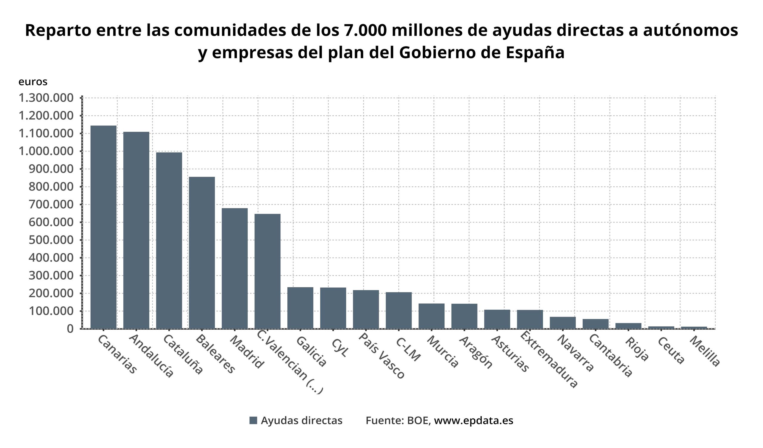 El reparto entre las comunidades autónomas de los 7.000 millones de euros con que está dotada la Línea Covid de ayudas directas a autónomos y empresas deja a Canarias como la principal receptora de estas ayudas, con 1.144,3 millones de euros, seguida de cerca por Andalucía, con 1.109,2 millones, y Cataluña, con 993,2 millones, lo que supone que estas tres autonomías recibirán el 46,38% de estas ayudas, mientras que la Comunidad de Madrid se sitúa en el quinto lugar de este reparto y recibirá 679.287,79, un 9,7% del total.