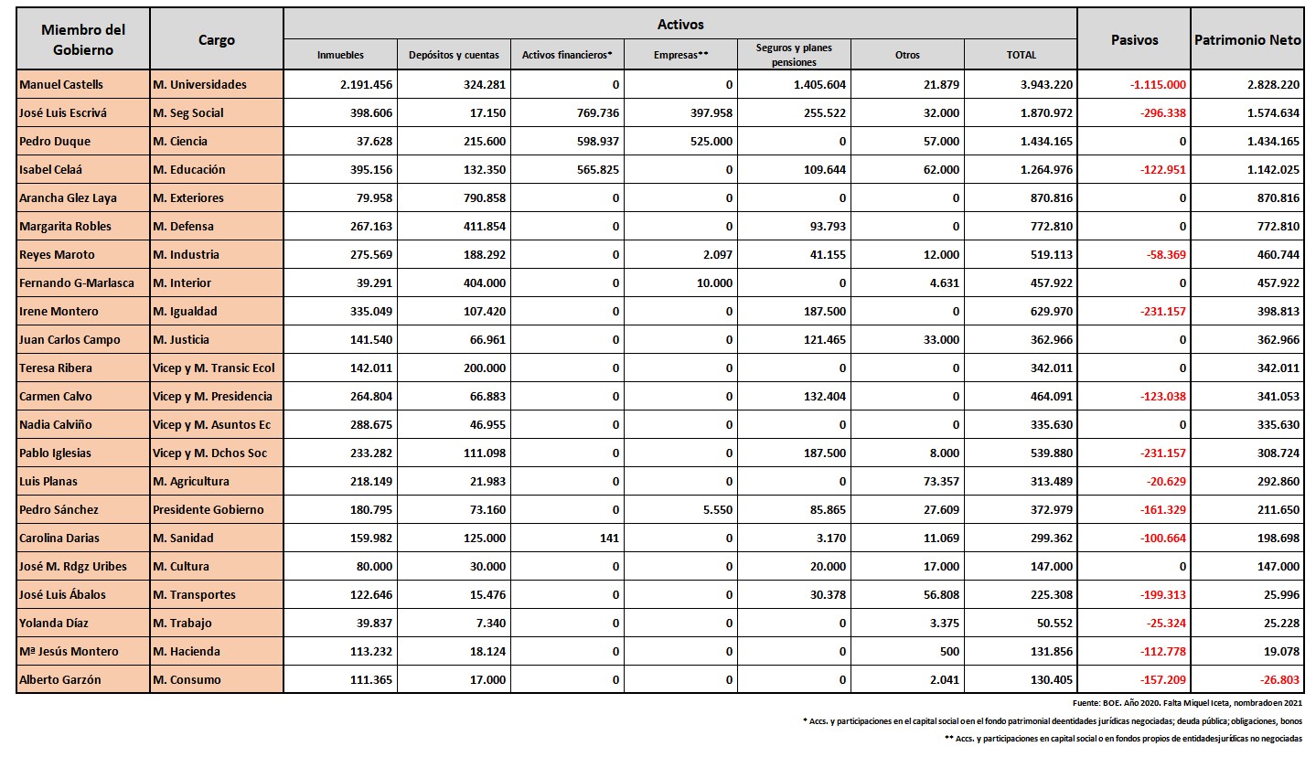 (1) La política española no te hace rico. Los miembros del Gobierno que acumulan más patrimonio son recién llegados (Castells, Escrivá, Duque, González Laya). La única excepción es Celaá, que sí lleva años ocupando diversos cargos públicos y tiene un patrimonio neto que supera el millón de euros: en su caso, el patrimonio parece que proviene del trabajo de su marido en una multinacional (y sobre Celaá sí ha habido algunas informaciones en el pasado que apuntaban a que declaraba menos patrimonio del que realmente poseía por la vía de ofrecer datos de valoración de los inmuebles por debajo del precio de mercado).