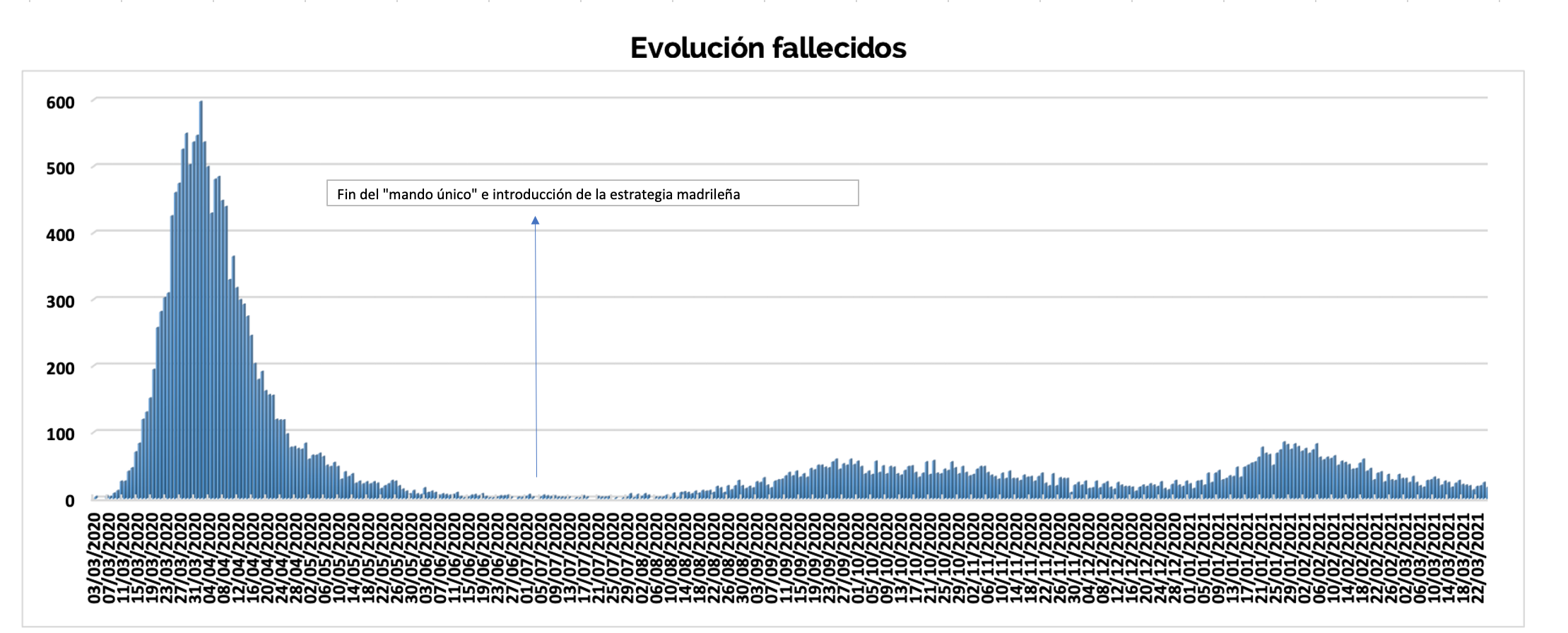 El siguiente gráfico muestra a la perfección que, desde el fin del "mando único" y la activación de la estrategia madrileña de adaptación, la cifra de fallecidos ha sido mucho más baja y moderada: