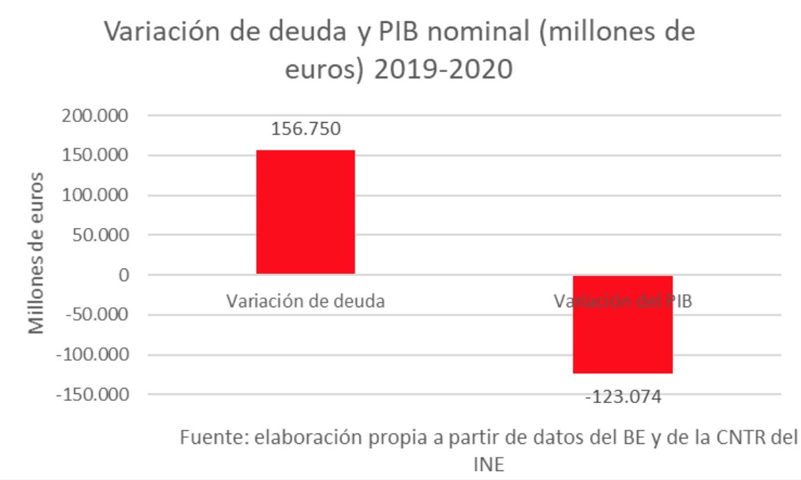En dicho cociente, ya está comenzando a operar el efecto negativo tanto en el numerador como en el denominador, pues la deuda aumenta en 156.750 millones de euros entre diciembre de 2019 y diciembre de 2020 y el PIB se reduce en 123.074 millones de euros de 2019 a 2020.