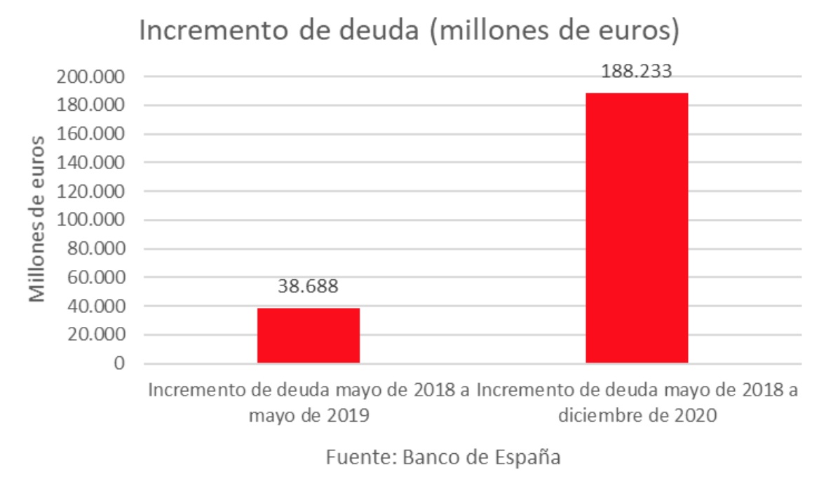 Todo ello, nos lleva a que desde que gobiernan Sánchez -con el apoyo de Iglesias- la deuda se ha incrementado en 188.233 millones de euros. Durante el primer año, aumentó en 38.688 millones, y al cabo de diez trimestres de mandato el incremento se aproxima ya a los 190.000 millones de euros.