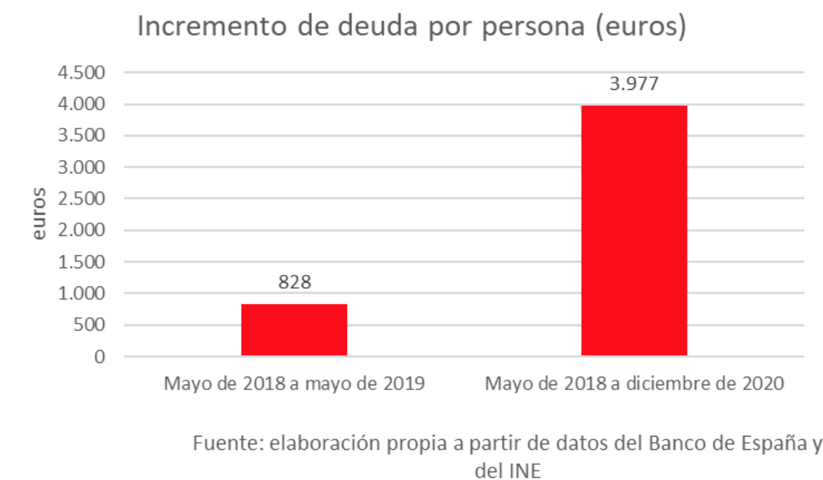 Así, si durante el primer año creció la deuda por persona en 828,03 euros, en todo el mandato de la izquierda la deuda por persona ha aumentado en 3.977 euros, casi cuatro veces el incremento del primer año.
