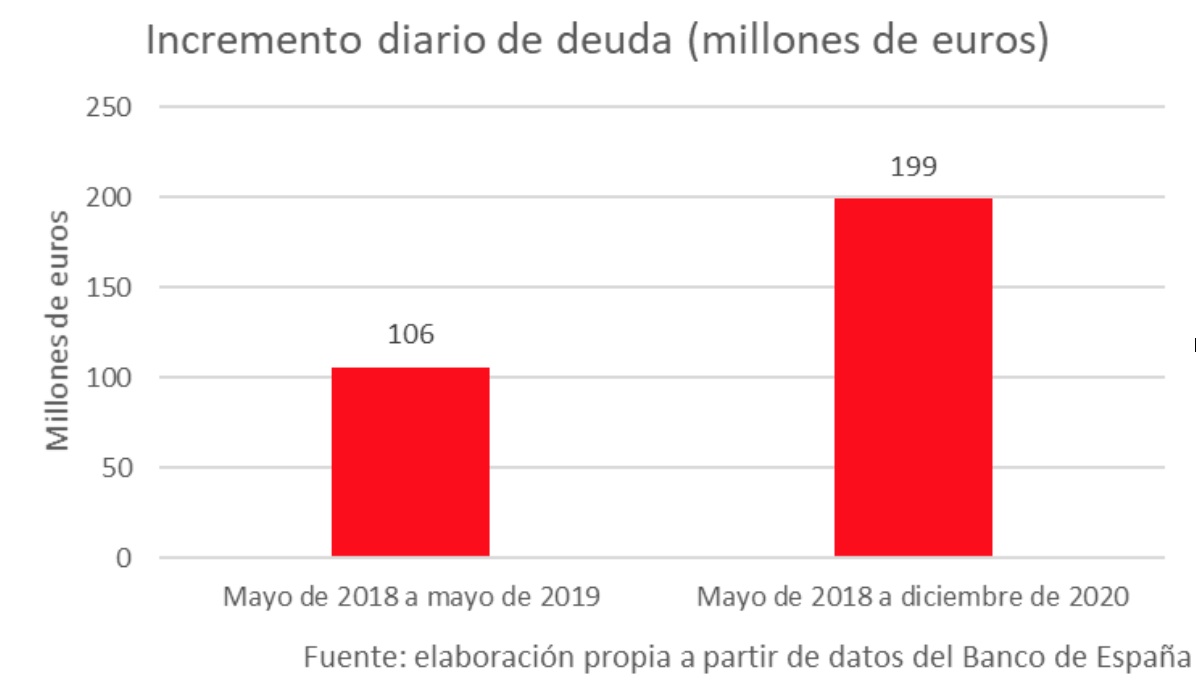 O visto de otra manera: en el primer año, la deuda se incrementaba a un ritmo de 105,99 millones de euros al día. Ahora, la deuda crece en España en 199,19 millones de euros cada día.