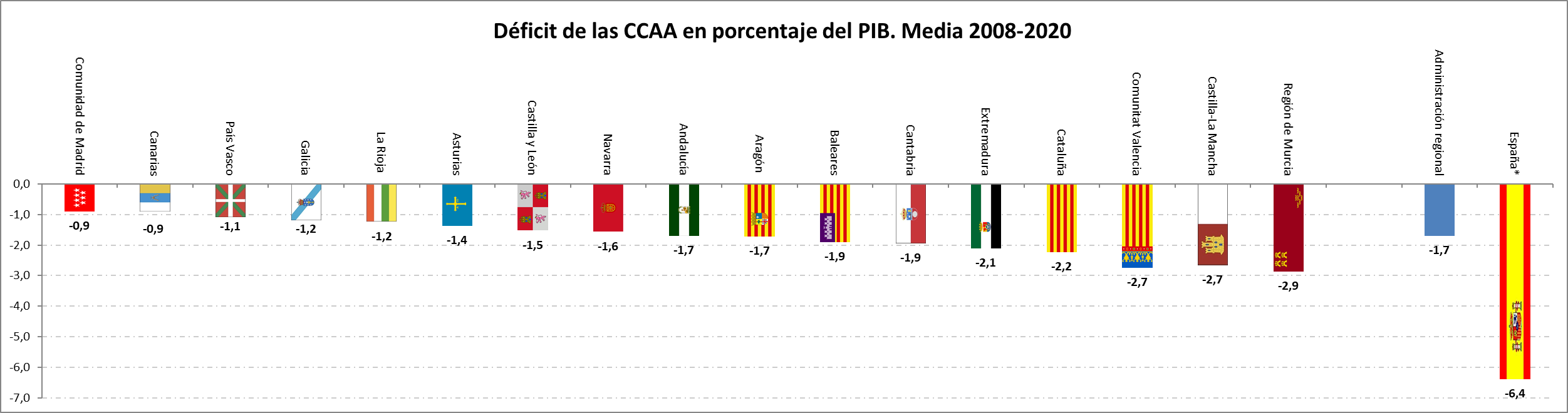 De esta forma, en ese período, Madrid ha tenido en media -junto con Canarias-, un déficit inferior al 1%, pese a ser una de las regiones peor financiadas por el Sistema de Financiación Autonómica (SFA), que le obliga a hacer un esfuerzo mayor que al resto de regiones, además de ejercer la mayor solidaridad de España, que permite, así, que las regiones menos prósperas puedan financiar sus servicios esenciales. Ese déficit medio de Madrid en ese período ha sido el menor de todas las CCAA, casi un punto menos que la media regional, 1,3 puntos menos que Cataluña y cinco puntos y medio menos que el conjunto de España.