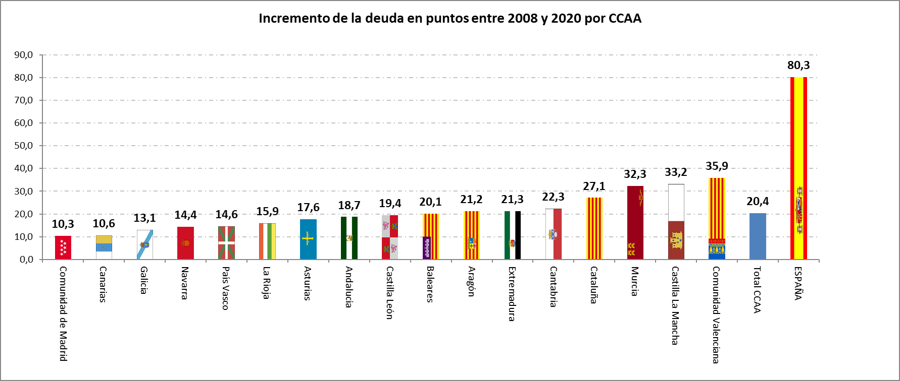 Esta política se traduce en un menor nivel de endeudamiento en dicho período, siendo Madrid la región con menor incremento de deuda en el período analizado, 10,3 puntos del PIB, frente a los 20,4 de la media regional, los 27,1 puntos de Cataluña, los 33,2 de Castilla-La Mancha, los 35,9 de Valencia y los 80,3 puntos del conjunto de España.