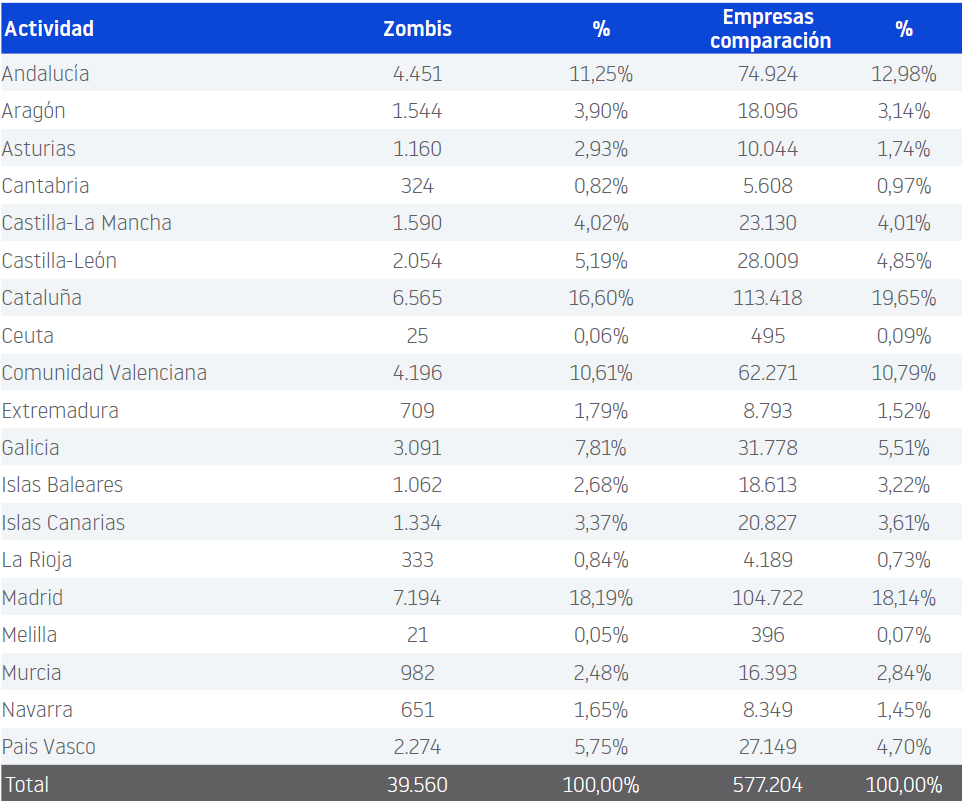 Por comunidades, Madrid concentra 7.194 empresas zombis, el 18 % del total, seguida por Cataluña con el 17 % y Andalucía y Valencia con un 11 % en ambos casos. Si miramos la diferencia con el porcentaje de empresas en general de las mismas características presentes en cada comunidad, en Madrid y Valencia esta cifra es similar, pero en Andalucía llega casi al 13 % y en Cataluña es más elevado también, el 20 %, por lo que su tasa relativa de empresas zombis es menor.
