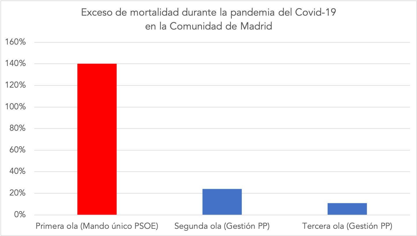 En la primera ola de contagios, cuando la gestión sanitaria estaba centralizada en manos del gobierno de Pedro Sánchez, el exceso de mortalidad reflejado por los informes del Instituto de Salud Carlos III ascendió al 140%. Sin embargo, durante la segunda ola, este porcentaje fue del 24% (situándose en el puesto 9 del índice autonómico, por detrás de otras ocho comunidades), mientras que en la tercera ola se redujo al 11% (colocándose en el puesto 11 del ranking regional, con otros diez territorios por delante).