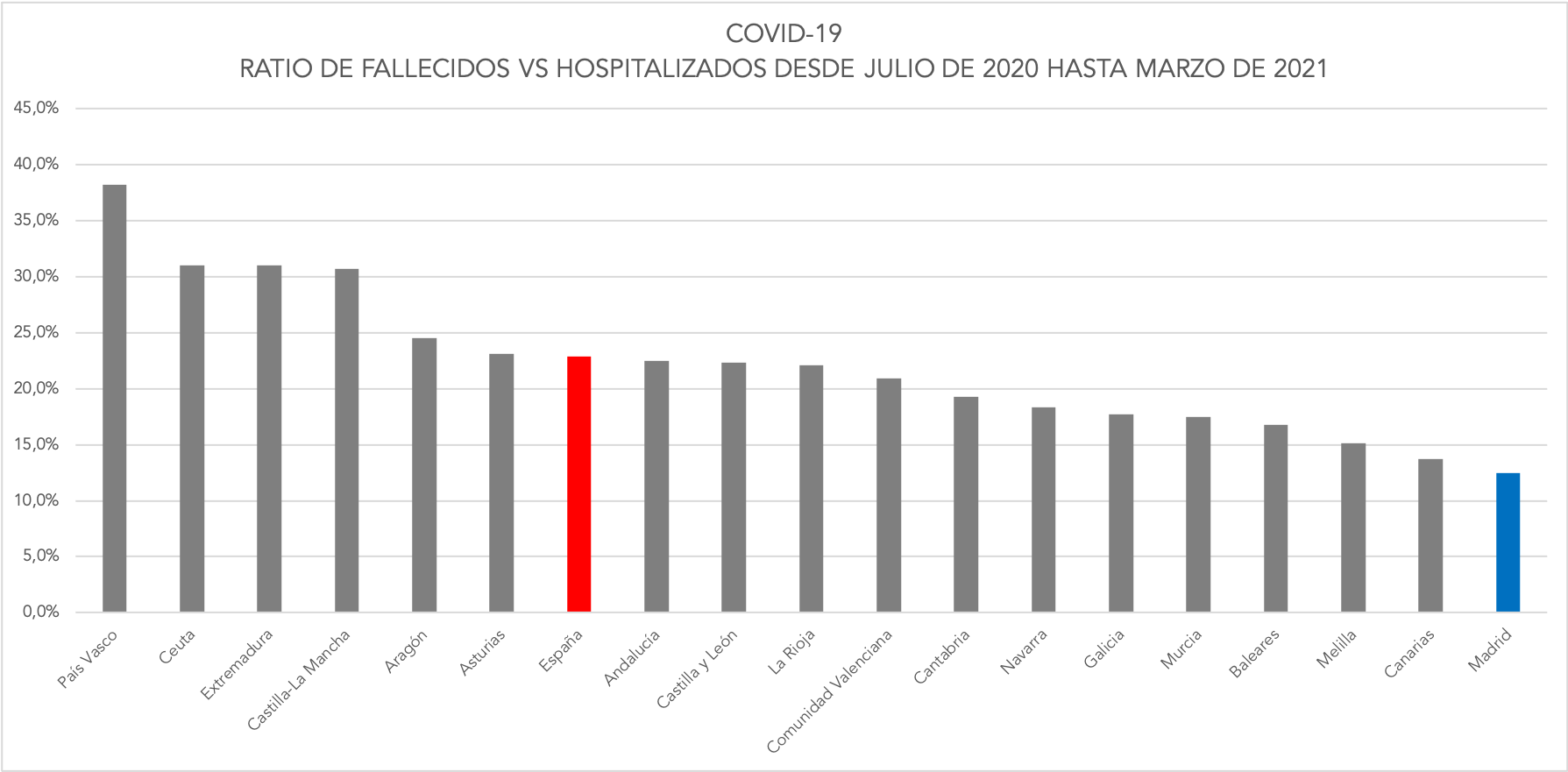 Si tomamos como referencia los meses de julio de 2020 y marzo de 2021 y comparamos el total de hospitalizados y fallecidos durante dicho periodo, podemos ver qué comunidades autónomas han tenido más y menos éxito en el tratamiento de los enfermos ingresados por covid-19. En este indicador vemos que Madrid aparece en la última posición, puesto que solo el 12,5% de sus hospitalizados han fallecido. El dato a nivel nacional es del 22,9%, de modo que Madrid se sitúa casi un 50% por debajo de la media.
