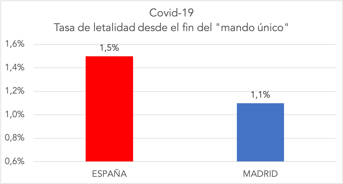 Desde el fin del "mando único" la tasa de letalidad observada en las comunidades autónomas asciende al 1,5%. Las regiones con peores resultados son Asturias y Aragón, donde este porcentaje llega al 3,5% y al 2,3%. Sin embargo, Madrid se sitúa por debajo del promedio nacional, con una tasa de letalidad del 1,2%.