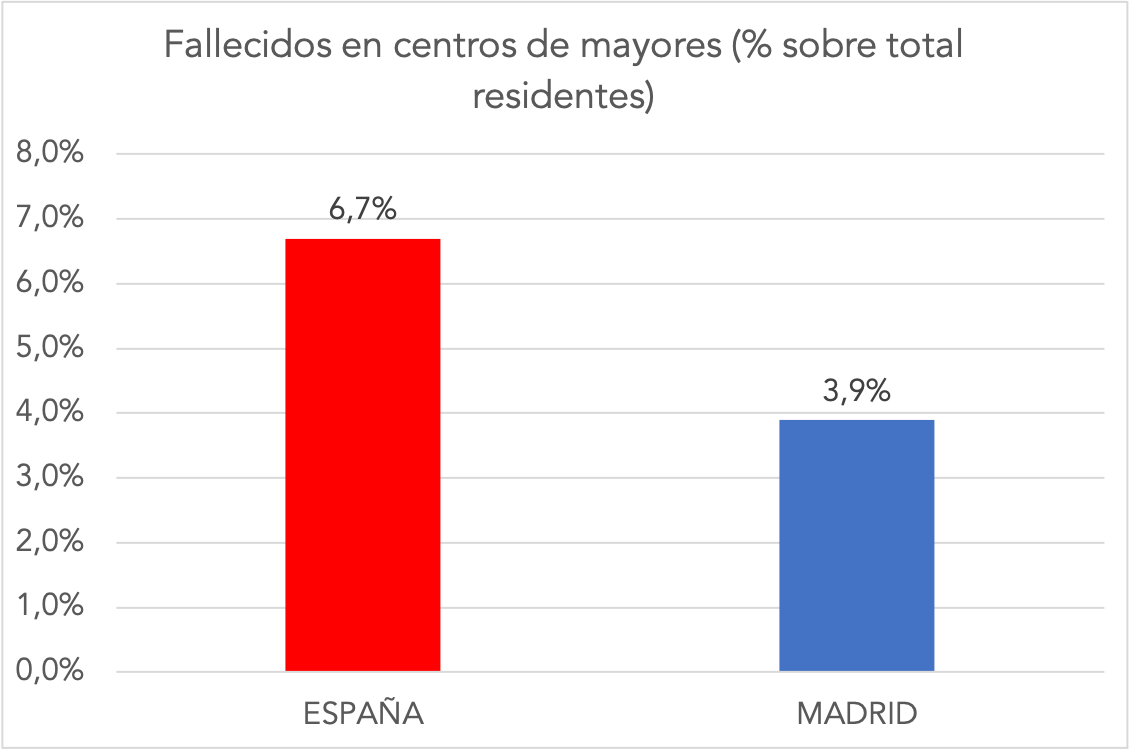 La comparación entre el número de residentes en centros de mayores y el total de fallecidos en estas instalaciones refleja que Madrid tiene el segundo ratio más bajo de todo el país, solamente por detrás de Canarias. En promedio, el covid-19 se ha cobrado la vida del 6,7% de los mayores residentes en estos centros, pero el porcentaje de Madrid es del 3,9%.