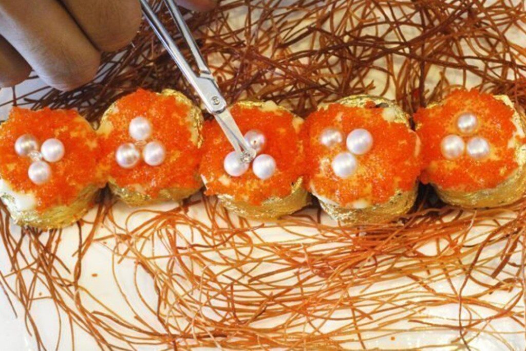 La elaboración sigue la tradicional receta, con la única modificación de sustituir el alga que envuelve al pescado por láminas de oro de 24 quilates cada una. Las perlas y los diamantes se ponen encima de cada una de las porciones para darles el toque sofisticado. Eso sí, la decisión de comerse o no las joyas depende de cada uno de los clientes que vayan al restaurante que el chef filipino tiene en Manila.