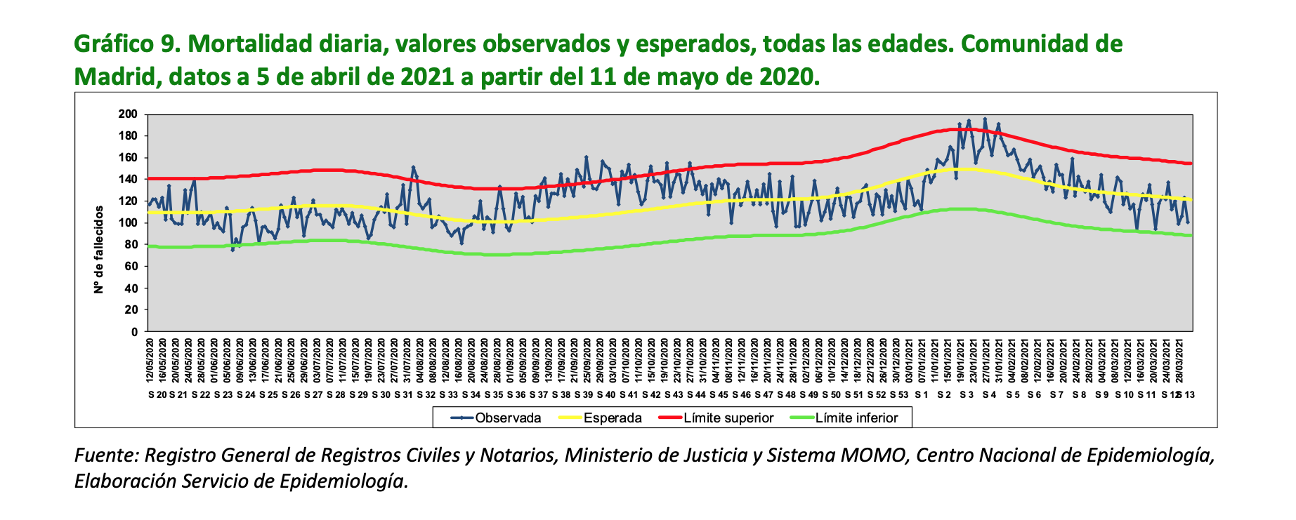 Conviene recordar, por otro lado, que la mortalidad registrada en las últimas cuatro semanas ha sido un 8% inferior de lo esperado según el promedio histórico, tal y como puede verse en el siguiente gráfico, lo que confirma que los datos de Madrid en esta "cuarta ola" están lejos de los niveles de histeria que promueve el discurso de la izquierda política y mediática.