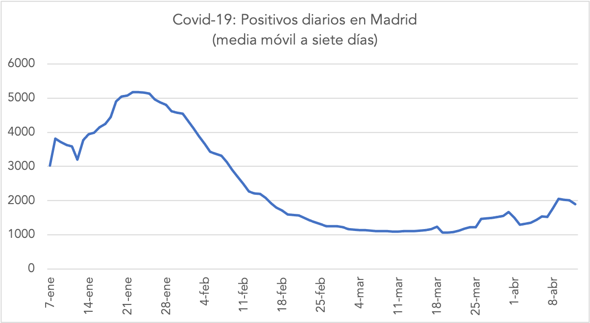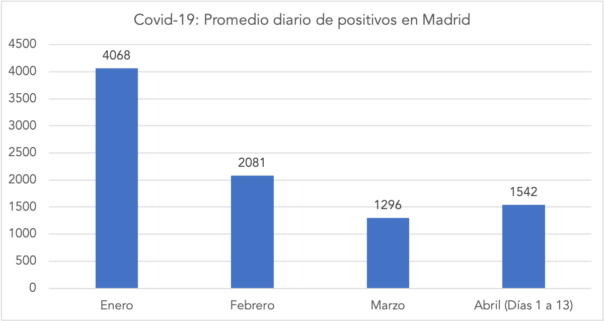 El promedio diario de positivos en Madrid también apunta en esta dirección. La cifra de enero fue de 4.068 infecciones por jornada, pero en febrero ya se produjo una rebaja hasta los 2.081 positivos diarios. El dato de marzo asciende a 1.296, mientras que en la primera mitad de abril se registra una media de 1.542 infecciones al día. Por lo tanto, los niveles actuales de propagación del coronavirus en Madrid son un 62% menos intensos que los de enero.