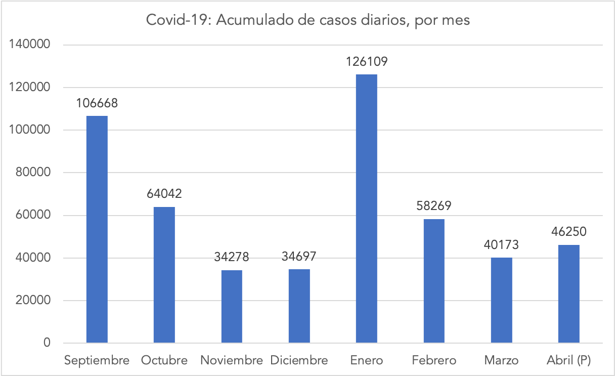 Por último, si ampliamos el foco para estudiar el acumulado de casos en los últimos meses, podemos ver que la cifra más alta fue la de enero (tercera ola), con 126.109 infecciones, mientras que la segunda fue la de septiembre (segunda ola), con 106.668 positivos. En cambio, los datos de febrero apuntan a 58.269 infecciones, los de marzo hablan de 40.173 positivos y la proyección para abril se sitúa en torno a los 46.250 contagios.