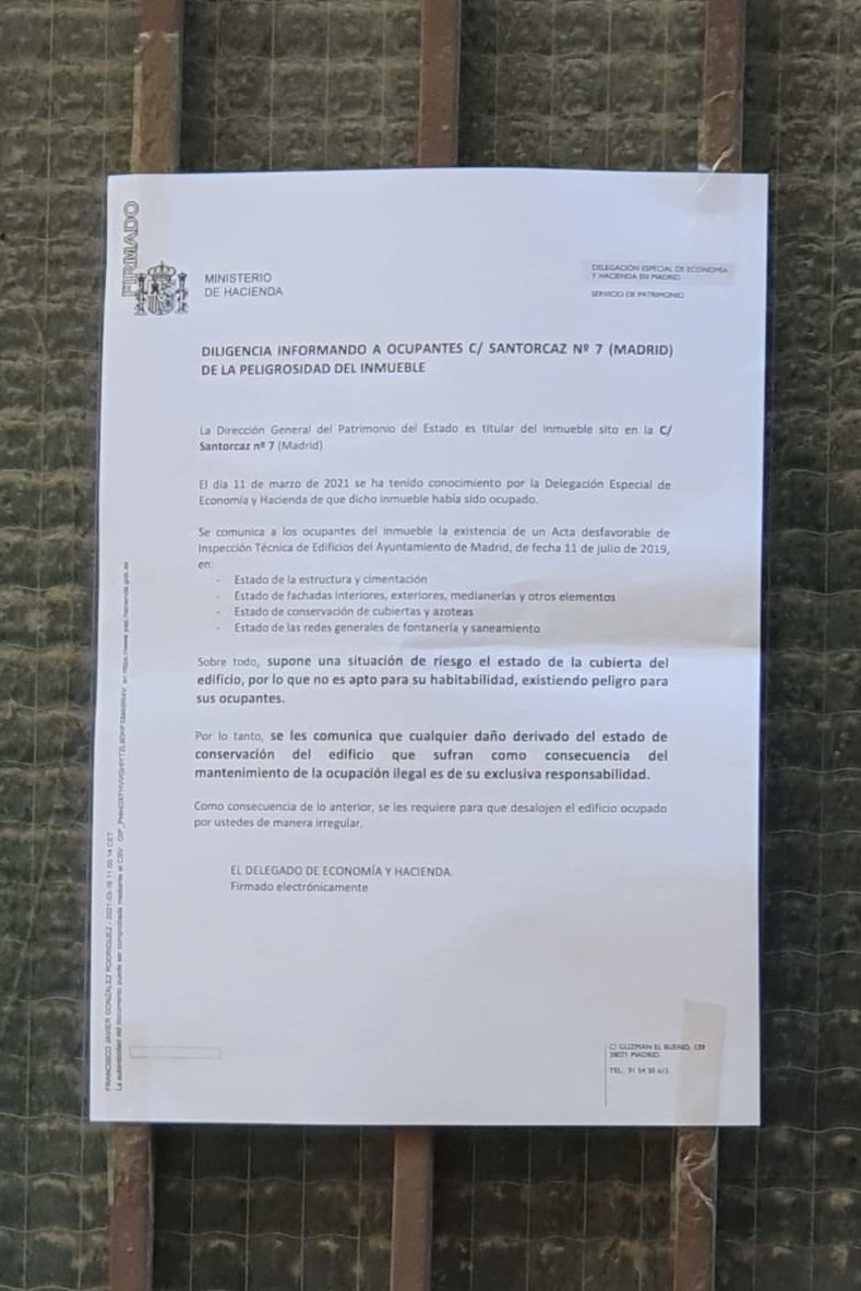 Hay riesgo de derrumbe y la propiedad, que es el Estado, lo sabe. Tanto es así que en una diligencia de la Dirección General del Patrimonio del Estado con fecha del mismo 11 de marzo, día de la okupación, ya les comunica que el inmueble "no es apto para su habitabilidad, existiendo riesgo para sus ocupantes" y les advierte de que "cualquier daño derivado del estado de conservación del edificio que sufran como consecuencia del mantenimiento de la ocupación ilegal es de su exclusiva responsabilidad".