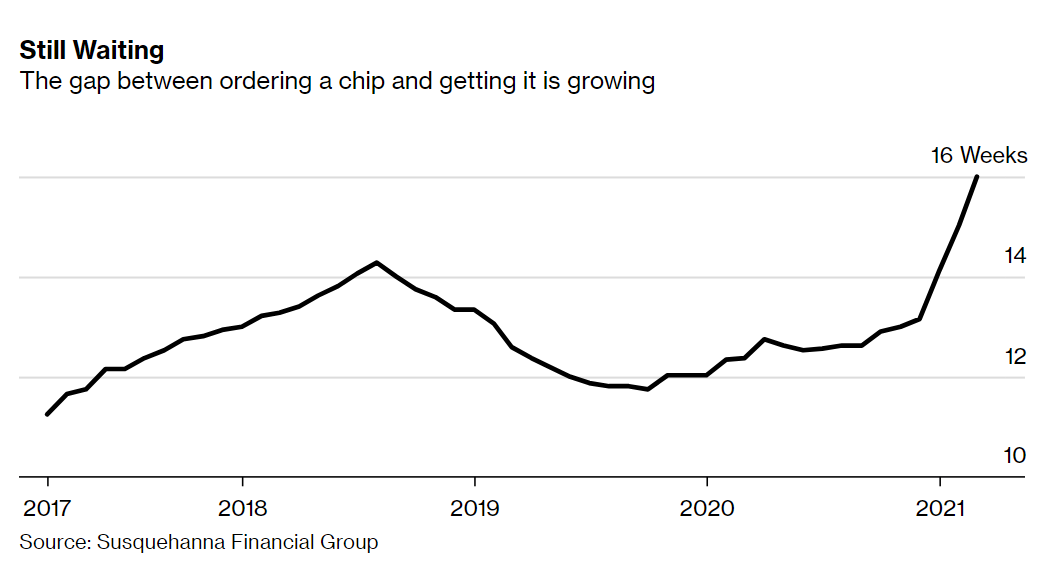 Sea como fuere, los tiempos de espera que se manejan actualmente entre que se pide un chip y se recibe han escalado por encima de las 16 semanas, como se observa en el siguiente gráfico de Bloomberg.