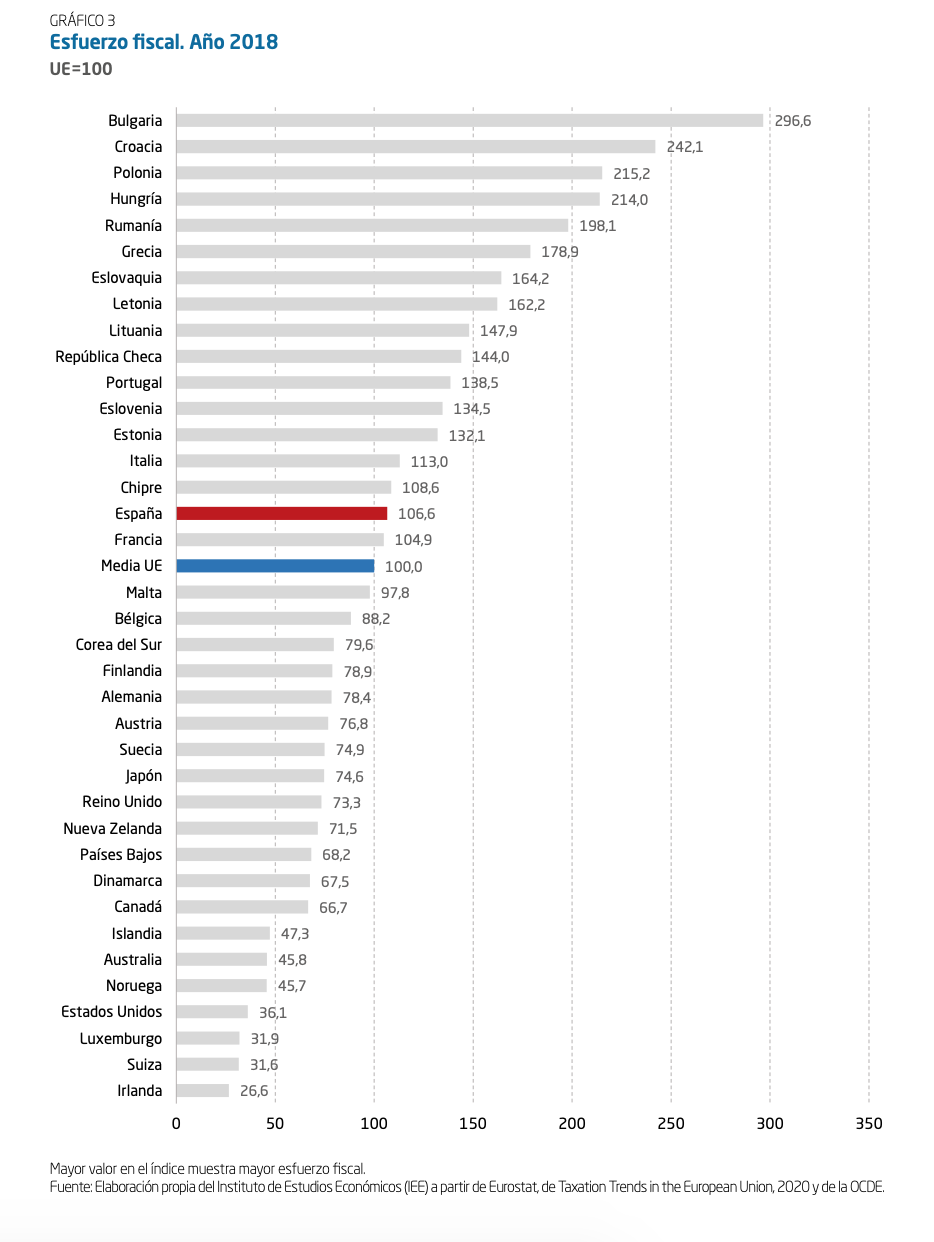 En la misma línea, es importante estudiar el peso que tienen los impuestos en relación con la renta de los ciudadanos, puesto que no es lo mismo recaudar un determinado porcentaje del PIB en un país rico que en uno pobre. Este ejercicio revela que el esfuerzo fiscal asumido por los españoles es un 6,6% superior al promedio de la UE-27, tal y como puede verse en el segundo gráfico.