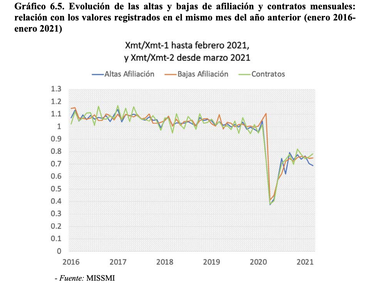 A nadie escapa que los primeros efectos de los confinamientos decretados por el gobierno para combatir la propagación del covid-19 fueron dramáticos para el empleo: "En marzo se produjo un aumento del paro registrado de más de 300.000 personas y una caída de la afiliación de más de 800.000 efectivos. En abril, el paro siguió creciendo al mismo ritmo pero la afiliación a la Seguridad Social comenzó a estabilizarse. Por otra parte, la relativa estabilidad de esta variable en ese momento podría dar una idea un tanto engañosa de la evolución del empleo pues en ella se incluye a los trabajadores afectados por ERTE, que no están trabajando o lo hacen sólo una parte de la jornada. El número de afectados por estos expedientes se disparó en abril hasta niveles nunca vistos, en torno a los 3,4 millones. A este grupo hay que sumar también los trabajadores por cuenta propia cubiertos por prestaciones extraordinarias por cese de actividad, que vendría a ser el equivalente a los ERTE para los autónomos. Este colectivo superó el millón de personas en los meses del inicio de la pandemia".