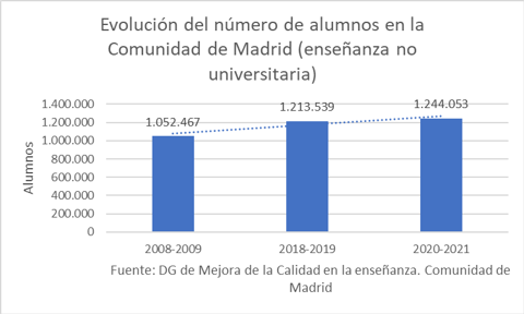 Madrid ha apostado por una educación basada en el esfuerzo y en el sacrificio, con recursos bien invertidos y crecientes, ante el reto de incremento de alumnos que ha acontecido en los últimos casi quince años, al pasar de un millón escaso en el curso 2008-2009 a casi un millón doscientos cincuenta mil en el curso 2020-2021.