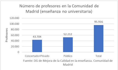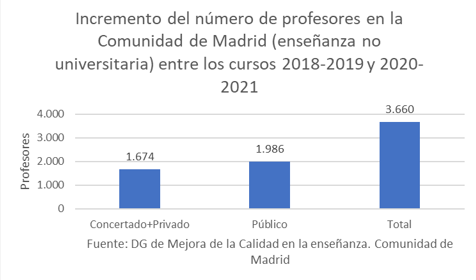 Para hacer frente a ello, el número de profesores en la Comunidad de Madrid ha aumentado un 13,93%, hasta llegar a los 52.212 profesores en la enseñanza pública y los 43.704 en en la suma de concertada y privada, con lo que el esfuerzo por el incremento realizado por la financiación pública (públicos más concertados) es muy importante.