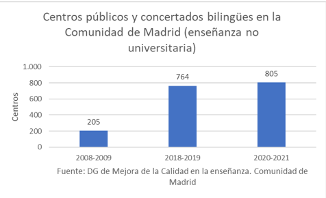 En este sentido, cuando se inició el programa bilingüe, en la primera legislatura de Esperanza Aguirre (2003-2007), comenzó a asentarse este sistema de éxito. Al principio, sólo en centros públicos, pero tras el curso 2008-2009 comenzaron a incorporarse centros concertados, es decir, centros que también contaban con financiación pública. De esa manera, se ha pasado de 205 centros públicos y concertados bilingües en el curso 2008-2009, a contar con 805, casi cuatro veces más, con un incremento de 41 nuevos centros en los dos años de Ayuso en el Gobierno, de los cuales 35 son públicos (entre colegios e institutos) y 6 son concertados.