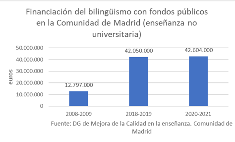 Y si por algo se ha destacado la excelencia de la educación en Madrid ha sido y es por el bilingüismo en inglés. Como decía Esperanza Aguirre, precursora de la iniciativa, no es que los alumnos diesen clase de inglés, sino que daban clase en inglés. Esto ha sido una de las iniciativas más eficientes y, además, de mayor redistribución, pues ha permitido que muchas familias sin recursos hayan podido enviar a sus hijos a colegios bilingües, dotando a todos de igualdad de oportunidades.