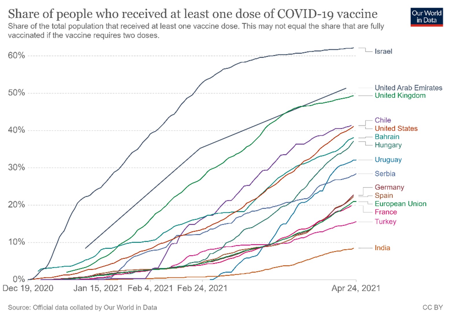 Todas las esperanzas en la recuperación de la economía y la vida normal tras la pandemia se centran en estos momentos en la vacunación. Sin embargo, lo cierto es que España, y la gran mayoría de países, siguen muy lejos de obtener una inmunidad de rebaño suficiente como para reabrir totalmente la actividad económica y social. Pero, como siempre, hay excepciones: según datos de Our World in Data actualizados a 24 de abril, Israel lidera la vacunación mundial con un 60% de la población que ha recibido al menos una dosis, seguido de Emiratos Árabes y Reino Unido, ambos en el entorno del 50%, mientras que Chile y Estados Unidos ya han inoculado dosis a más del 40% de la población.