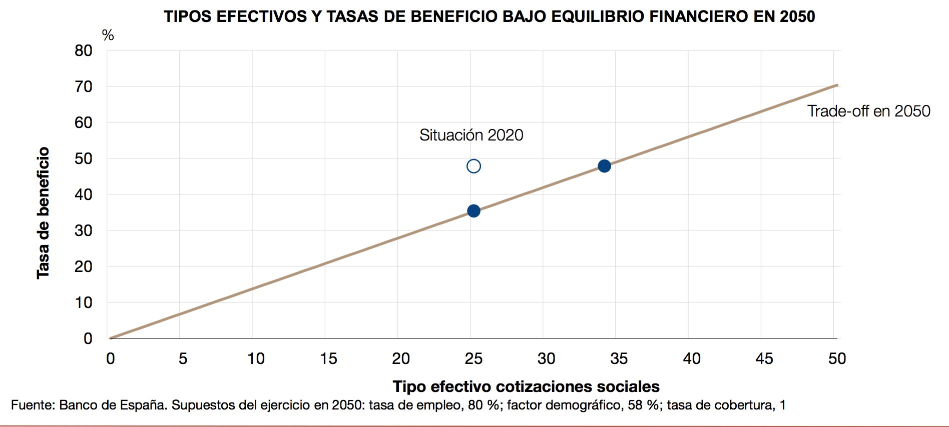 "Mantener la tasa de beneficio actual exigiría un aumento notable de las contribuciones, y mantener las contribuciones actuales comportaría una reducción significativa de la tasa de beneficio", reza el informe sobre el que sostiene estas declaraciones. Esto significa que el Estado tendría que subir todavía más los impuestos a los asfixiados trabajadores de nuestro país. En concreto, "con tasas de empleo y dependencia del 80% y 58% en 2050, respectivamente, el tipo efectivo de las cotizaciones sociales debería subir unos 8 puntos para mantener la tasa de beneficio actual".