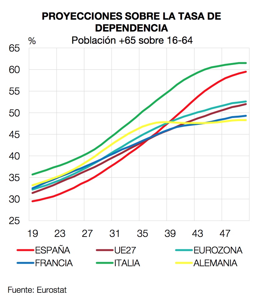 "El envejecimiento de la población española provocará un incremento muy sustancial de la ratio de dependencia. Los ajustes en este ámbito se verán influidos por la evolución de la propensión social hacia la introducción de ciertas reformas", añade el informe.
