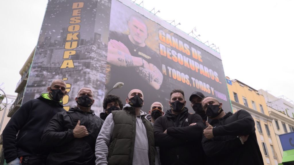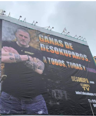 Daniel Esteve, propietario de la conocida empresa Desokupa, ha desplegado un cartel gigante junto a su equipo en la calle Alonso Cano número 24 de Madrid. El mensaje que aparece, "Ganas de desokuparos a todos, todas y todes", va dirigido a Podemos, debido a las críticas y descalificativos que el partido de extrema izquierda realiza continuamente contra los trabajadores de la empresa de desalojo.