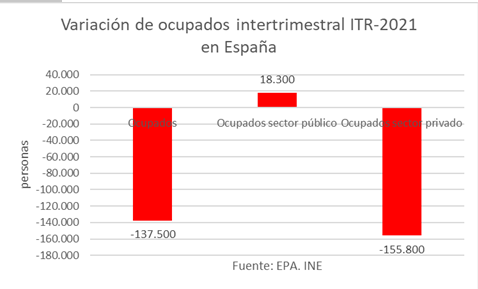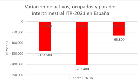 Esta caída de actividad en España dibuja una bajada del paro engañosa en el conjunto nacional, pues todo lo que baja el paro se debe al abandono del mercado laboral por todas esas personas antes mencionadas. Cae el empleo en 137.500 personas y baja el número de activos en 203.400, de manera que la diferencia es el descenso del paro, 65.800 personas, pero no por creación de empleo, sino porque se destruye tanto y son tan malas las perspectivas con las políticas restrictivas de Sánchez, que cunde el desánimo.