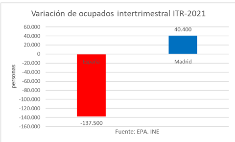 Frente a esta intensa destrucción de empleo, en el mismo trimestre en Madrid, con una política distinta, basada en la libertad y en las menores restricciones posibles en este escenario de pandemia en el que nos encontramos, se crearon 40.400 puestos de trabajo.