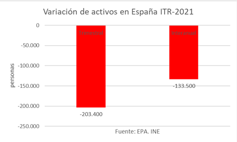 Esto no queda ahí, pues las políticas de la izquierda, basadas en los impuestos altos, el gasto desmedido, el intervencionismo y las múltiples prohibiciones impuestas desde hace más de un año, están provocando una desesperanza enorme entre los españoles, muchos de los cuales están dejando de buscar empleo. Así, hay 203.400 activos menos en este trimestre en el conjunto nacional, es decir, 203.400 personas que su desesperanza es tal, derivado del escenario económico restrictivo impuesto por el Gobierno, que ya ni siquiera tienen ánimo para buscar un puesto de trabajo, pues creen que no lo van a encontrar. Es más, cada vez es más intensa esa desesperanza, pues ahora llega a la cifra mencionada, mientras que en el último año el número de activos se reduce en 133.500 personas.