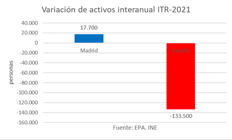 En Madrid, sin embargo, la situación es diametralmente opuesta, ya que apenas se pierden activos en el trimestre (9.800), mientras que en tasa interanual aumenta el número de activos en 17.700 personas, frente a la caída antes comentada de 133.500 activos en el conjunto nacional.