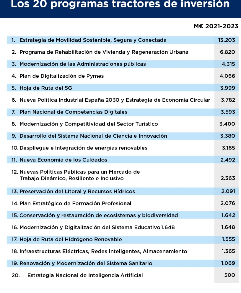 También hay un programa de rehabilitación de vivienda y regeneración urbana, con unos recursos de 6.820 millones de euros; y la modernización de las administraciones públicas, de 4.315 millones de euros. También el plan de digitalización de pymes, con más de 4.060 millones de euros; la hoja de ruta del 5G, con casi 4.000 millones de euros; y una nueva política industrial "España 2030 y Estrategia de Economía Circular", dotada con más de 3.780 millones de euros.