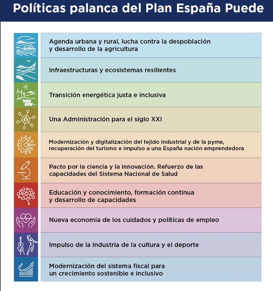 Los 4 ejes van a proyectarse en 10 políticas palanca, "de gran capacidad de arrastre sobre la actividad y el empleo ya en la primera fase del Plan", según el Gobierno. ¿Servirá la nueva economía de los cuidados entre otros de los 10 puntos para favorecer el empleo? Será difícil.