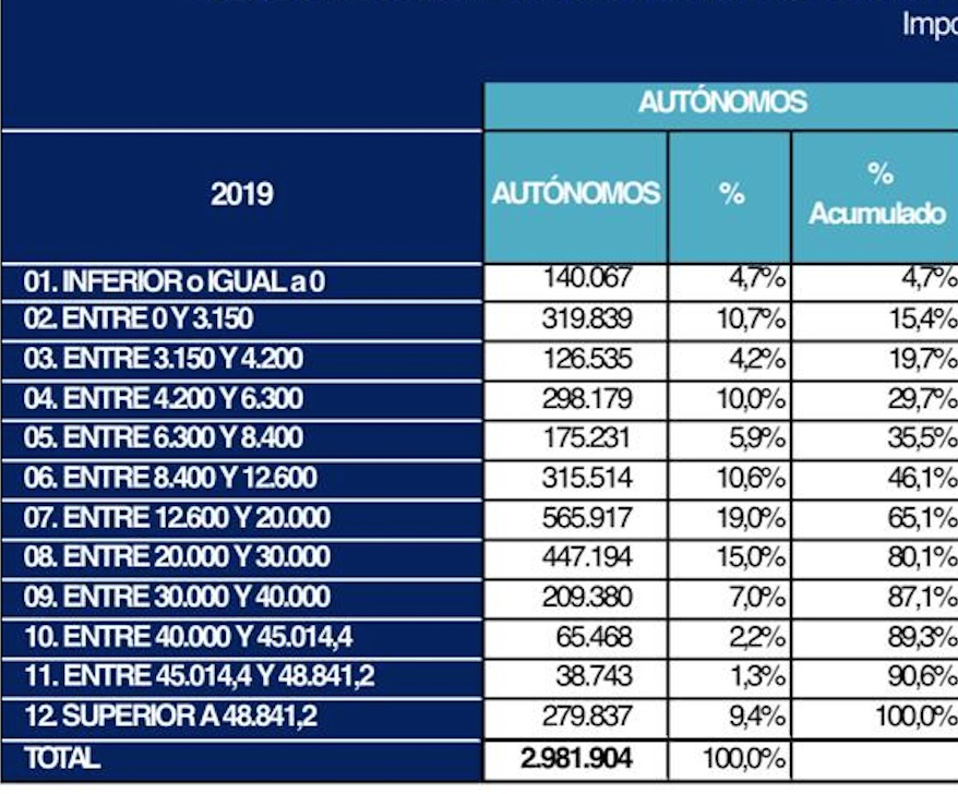 Pero, ¿y cuántos autónomos en España ganan más de esa modesta cantidad? La siguiente tabla muestra los rendimientos que obtuvo cada uno de los 3 millones de autónomos que hay en España. Si sumamos todos los autónomos desde la franja 8, que son los que ganan entre 20.000 y 30.000 euros, el resultado es que más de un millón de autónomos (exactamente, 1.040.622) se verían perjudicados por el palo de la Seguridad Social. Esta es una cifra aproximada. Probablemente, la real se sitúe por debajo de esta barrera, ya que el planteamiento del Gobierno es que la cuota de autónomos comience a subir a partir de 22.000 euros (y estamos contando desde 20.000). Además, como ya hemos dicho, el 20% cotiza por bases superiores y lo estamos comparando en todo momento con la mínima, que es la que usa el 80% de los autónomos físicos.
