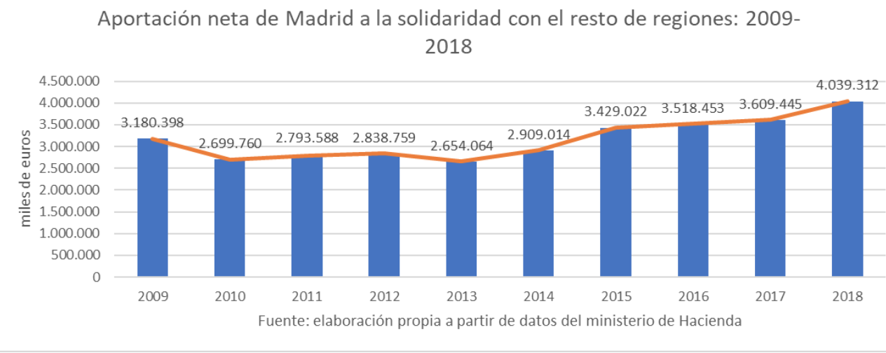 Y, para finalizar, esa aportación de Madrid ha sido creciente en el tiempo: ha pasado de aportar a la solidaridad 3.180 millones en 2009 a aportar 4.039 millones en 2018. Esto no sólo demuestra que Madrid aporta más, sino que cuanto más crece Madrid, más aporta, de manera que si se le impidiese seguir con la política de bajada de impuestos que ha impulsado más su crecimiento, perderían también el resto de regiones, al poder aportar menos por crecer menos.