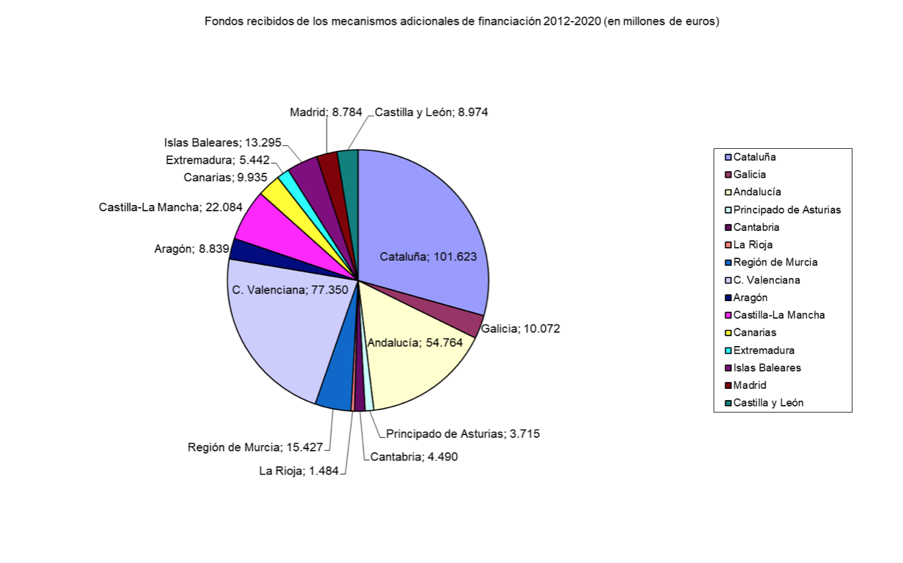 Cataluña es quien más recursos ha recibido del FLA-Fondo de Facilidad Financiera, con el 34% del total de fondos del FLA. Es decir, si Cataluña no ha colapsado financieramente ha sido gracias al respaldo del Tesoro español, que ha cubierto casi el 80% de toda la deuda viva que tiene Cataluña.